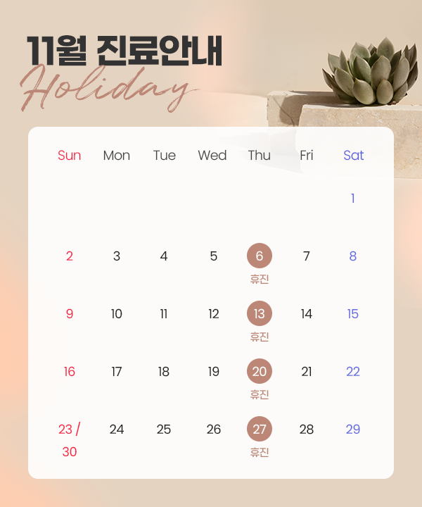 ※ 목요일, 일요일 휴진, 공휴일이 있는주는 목요일에 진료합니다.